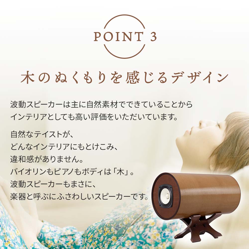 最先端の波動エネルギー技術を導入することにより、今までのスピーカーでは実現できなかったリアルで臨場感あふれる音場を生み出すことに成功しました。