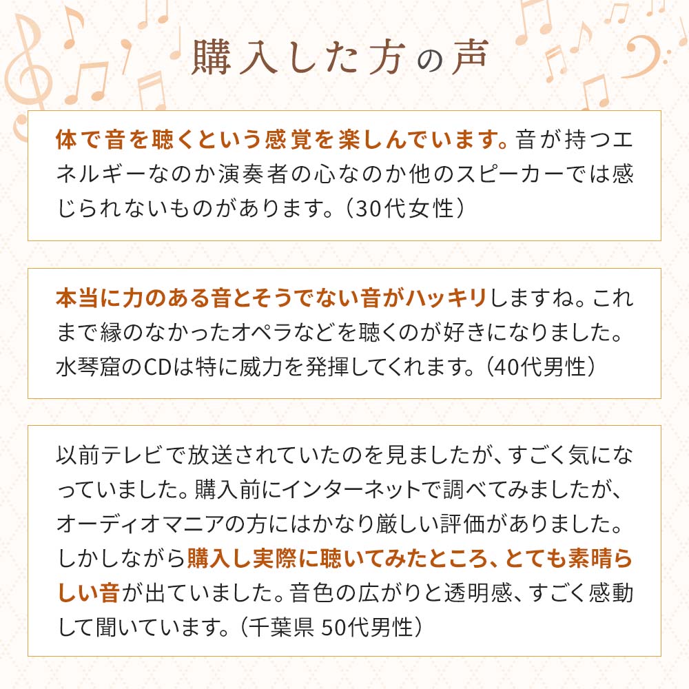 これまで縁のなかったオペラなどを聴くのが好きになりました。水琴窟のCDは特に威力を発揮してくれます。