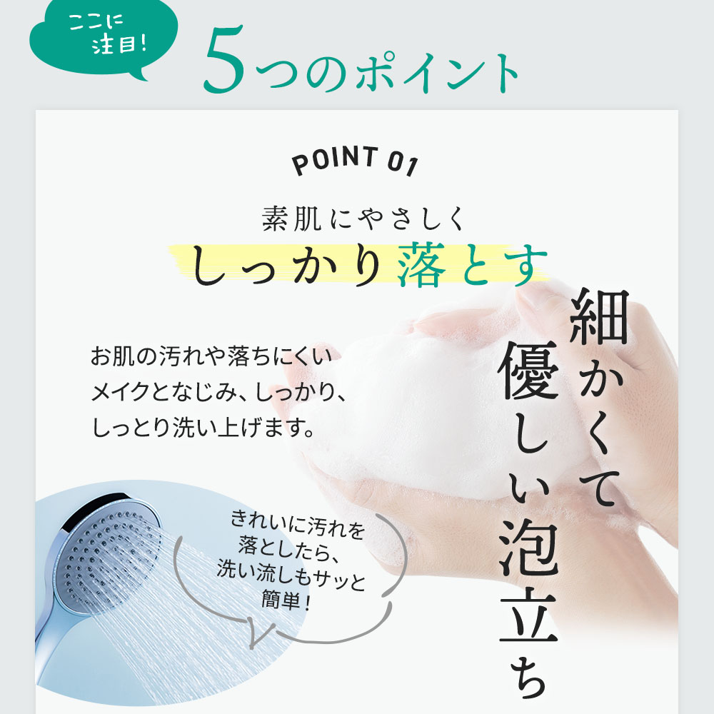 細かくて優しい泡立ちで、お肌の汚れや落ちにくいメイクともなじみ、しっかりしっとり洗い上げます。