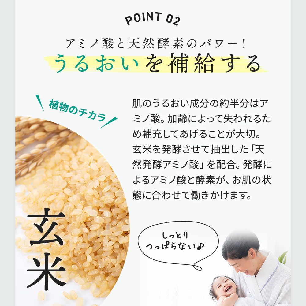 玄米を発酵させて抽出した「天然発酵アミノ酸」を配合。発酵によるアミノ酸と酵素が、お肌の状態に合わせて働きかけます。 - Point3: