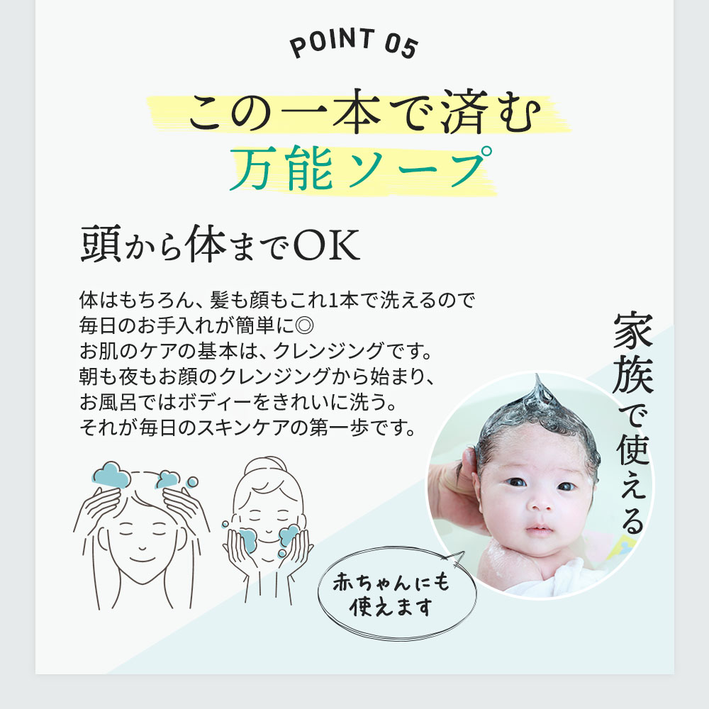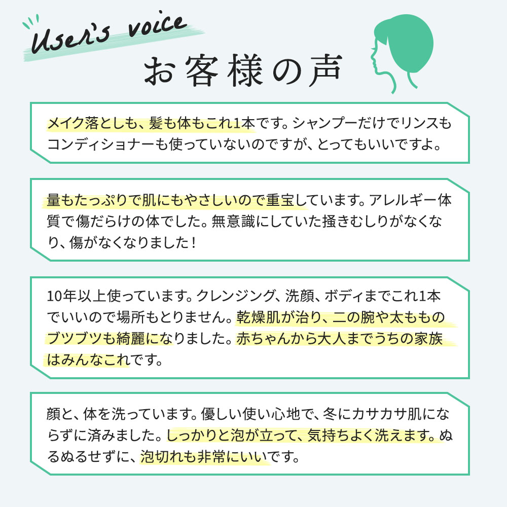 - デリケートなお肌に安心な天然植物性で顔も体も洗え無香料・無着色・無防腐剤だから<安心して家族みんなで使えます。