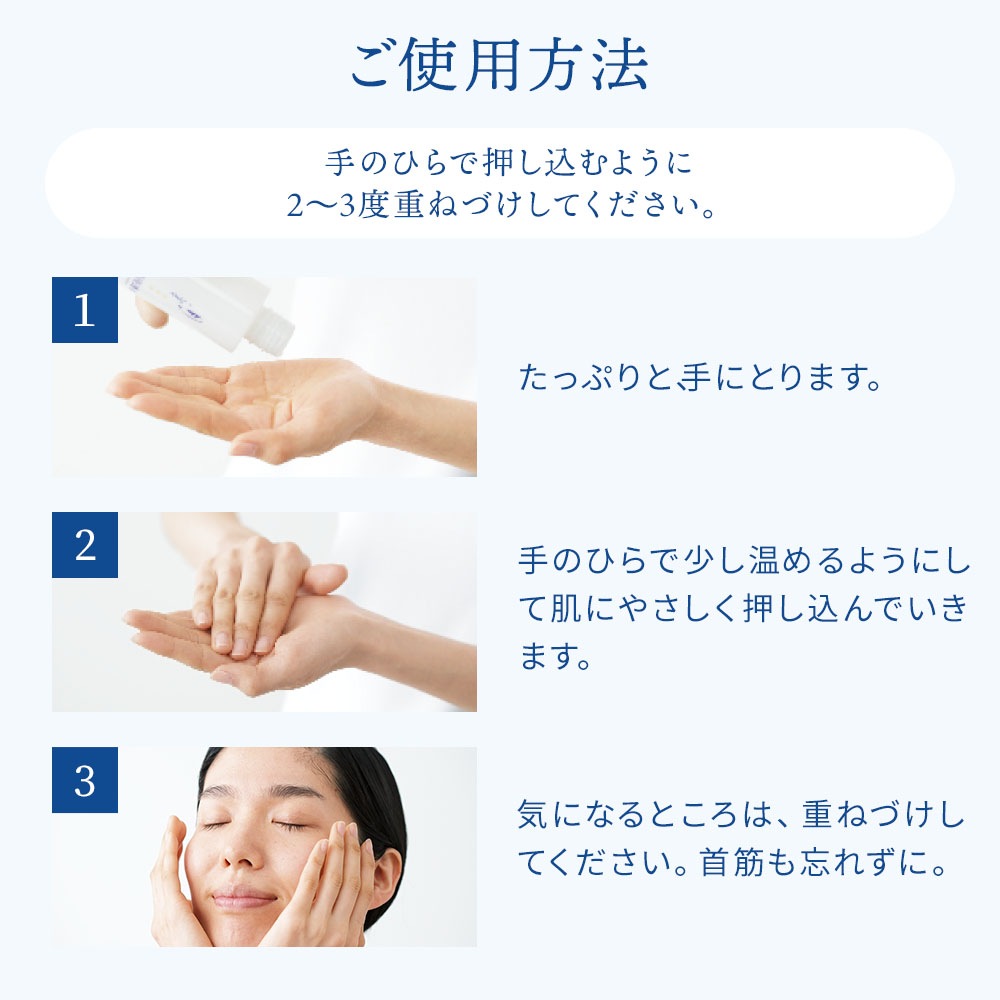 手のひらで少し温めるようにして肌にやさしく押し込んでいきます。
