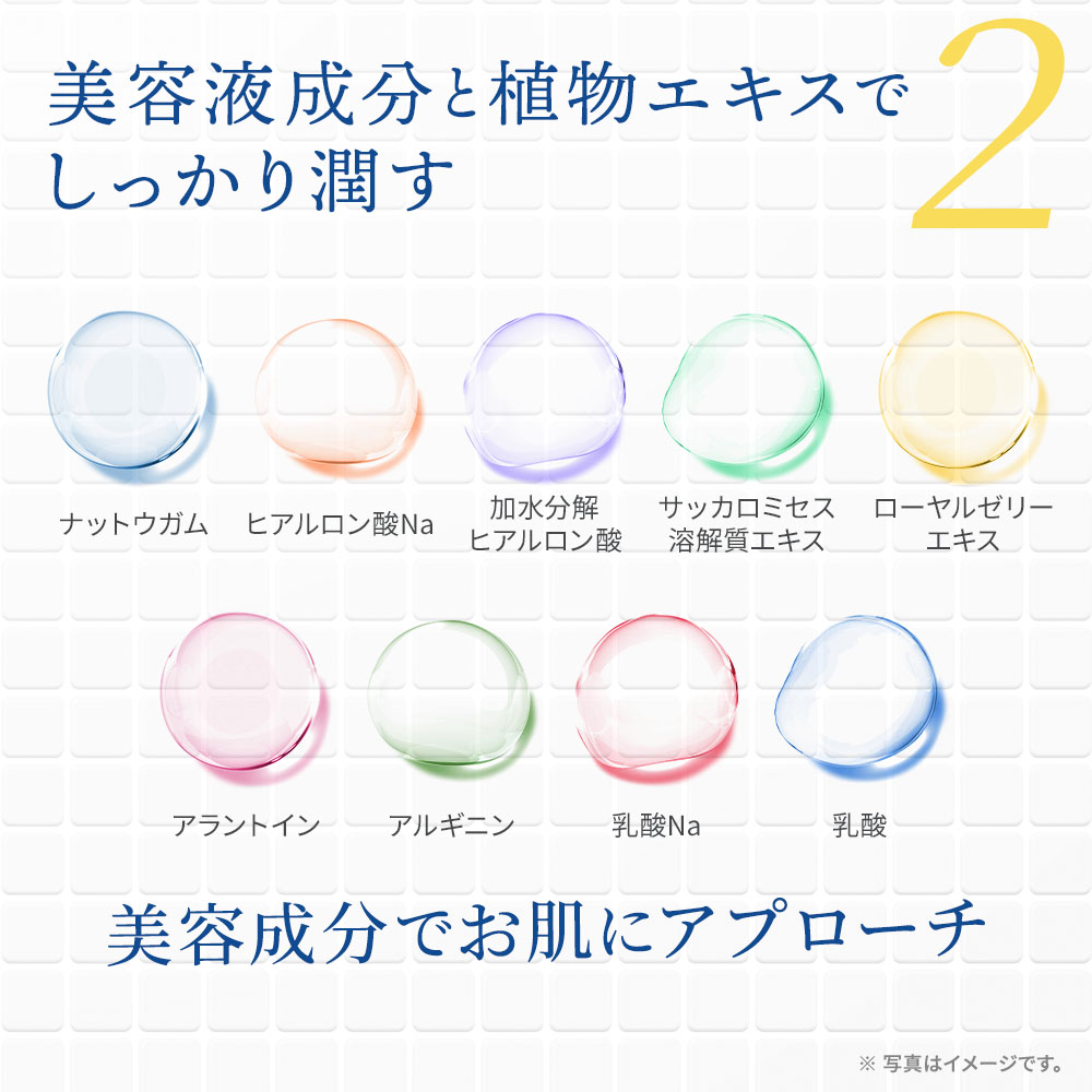 - トチャカエキス、褐藻エキス、ナットウガム、ヒアルロン酸Na、加水分解ヒアルロン酸、サッカロミセス溶解質エキス、ローヤルゼリーエキス、アラントイン、アルギニン、乳酸Na、乳酸、キュウリ果実エキス、ハマメリス葉エキス、オタネニンジン根エキス、マグワ根皮エキスなど