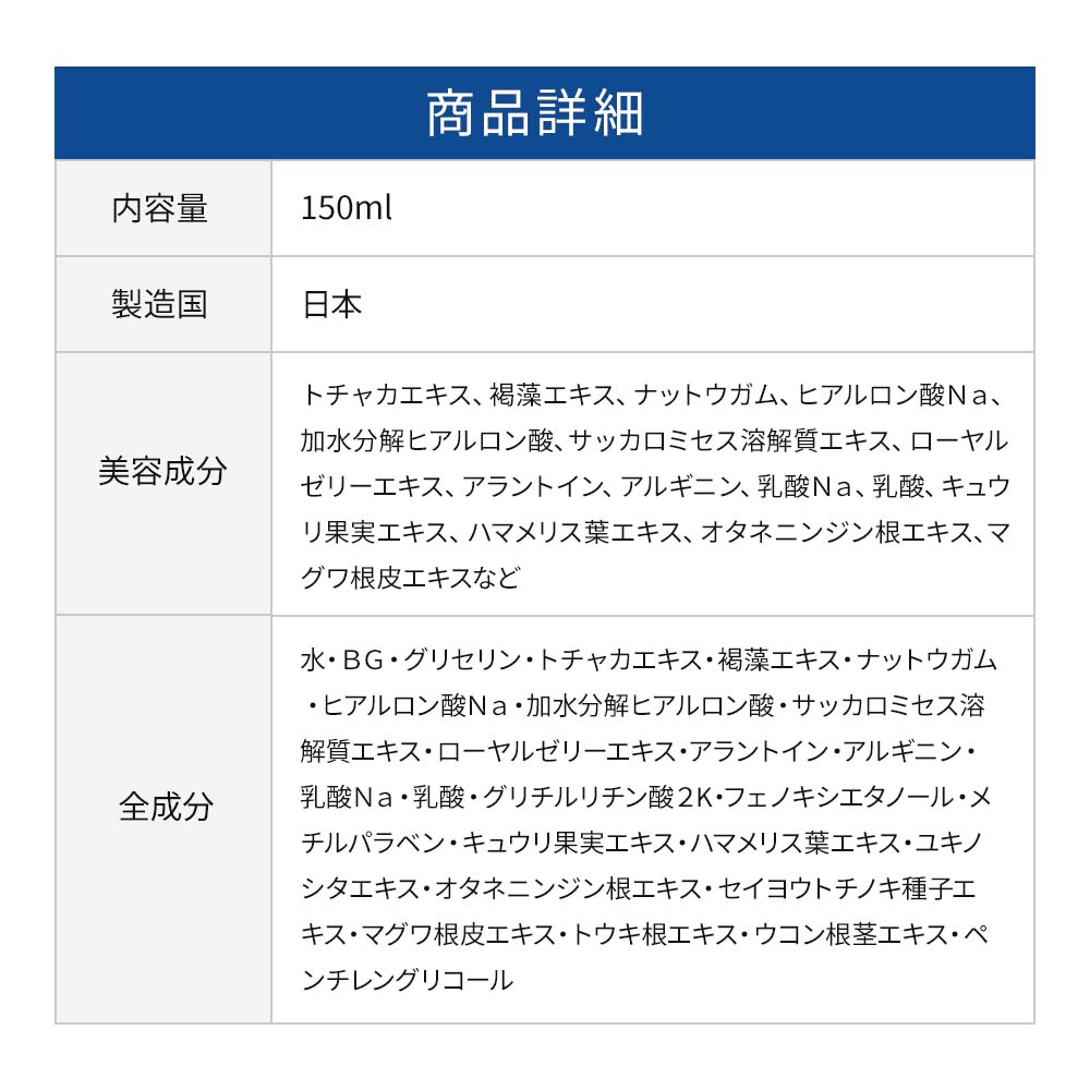 - 水・BG・グリセリン・トチャカエキス・褐藻エキス・ナットウガム・ヒアルロン酸Na・加水分解ヒアルロン酸・サッカロミセス溶解質エキス・ローヤルゼリーエキス・アラントイン・アルギニン・乳酸Na・乳酸・グリチルリチン酸2K・フェノキシエタノール・メチルパラベン・キュウリ果実エキス・ハマメリス葉エキス・ユキノシタエキス・オタネニンジン根エキス・セイヨウトチノキ種子エキス・マグワ根皮エキス・トウキ根エキス・ウコン根茎エキス・ペンチレングリコール