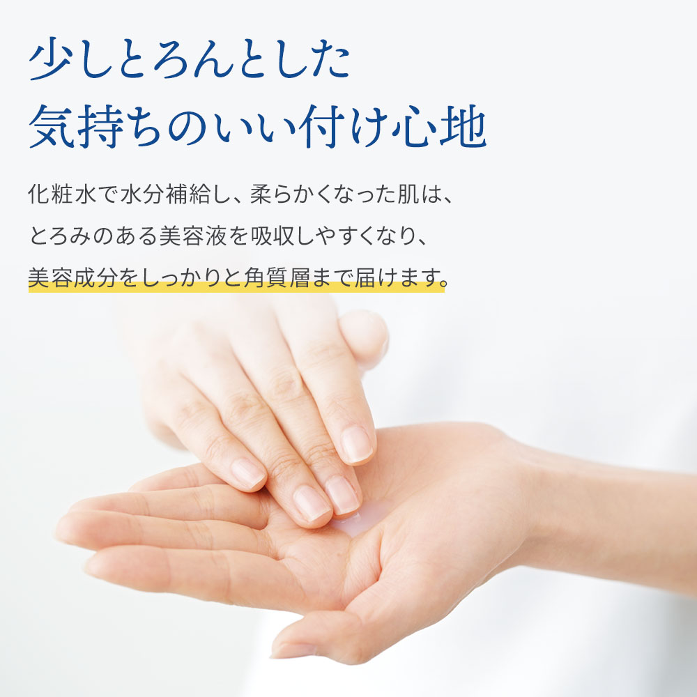 化粧水で水分補給し、柔らかくなった肌は、とろみのある美容液を吸収しやすくなり、美容成分をしっかりと角質層まで届けます。