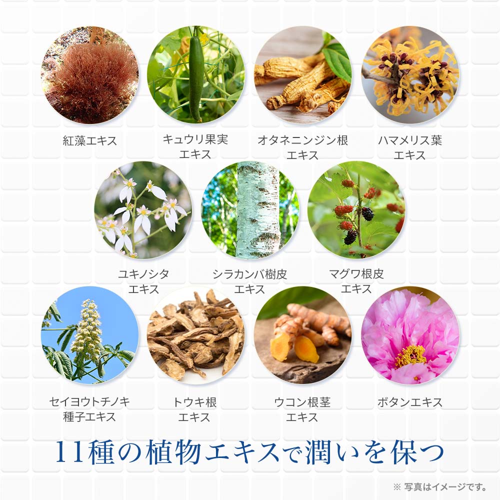 - スクワラン・ホホバ種子油・トコフェロール・紅藻エキス・ナットウガム・ヒアルロン酸Na・加水分解ヒアルロン酸・リン酸アスコルビルMg・サッカロミセス溶解質エキス・コメヌカスフィンゴ糖脂質・ローヤルゼリーエキス・アラントイン・アルギニン・乳酸Na・乳酸・キュウリ果実エキス・オタネニンジン根エキス・ハマメリス葉エキス・シラカンバ樹皮エキス・マグワ根皮エキス・ボタンエキスなど