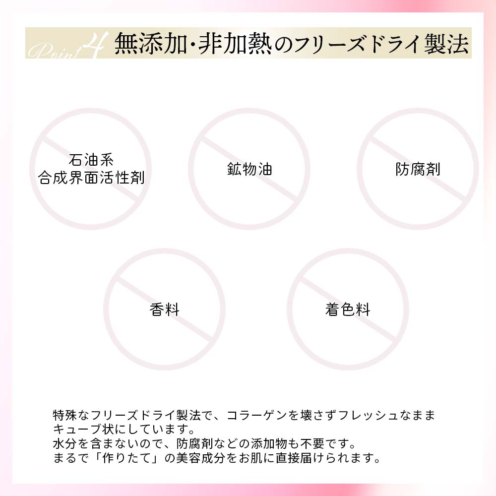 特殊なフリーズドライ製法で、コラーゲンを壊さずフレッシュなままキューブ状にしています。 水分を含まないので、防腐剤などの添加物も不要です。 まるで「作りたて」の美容成分をお肌に直接届けられます。