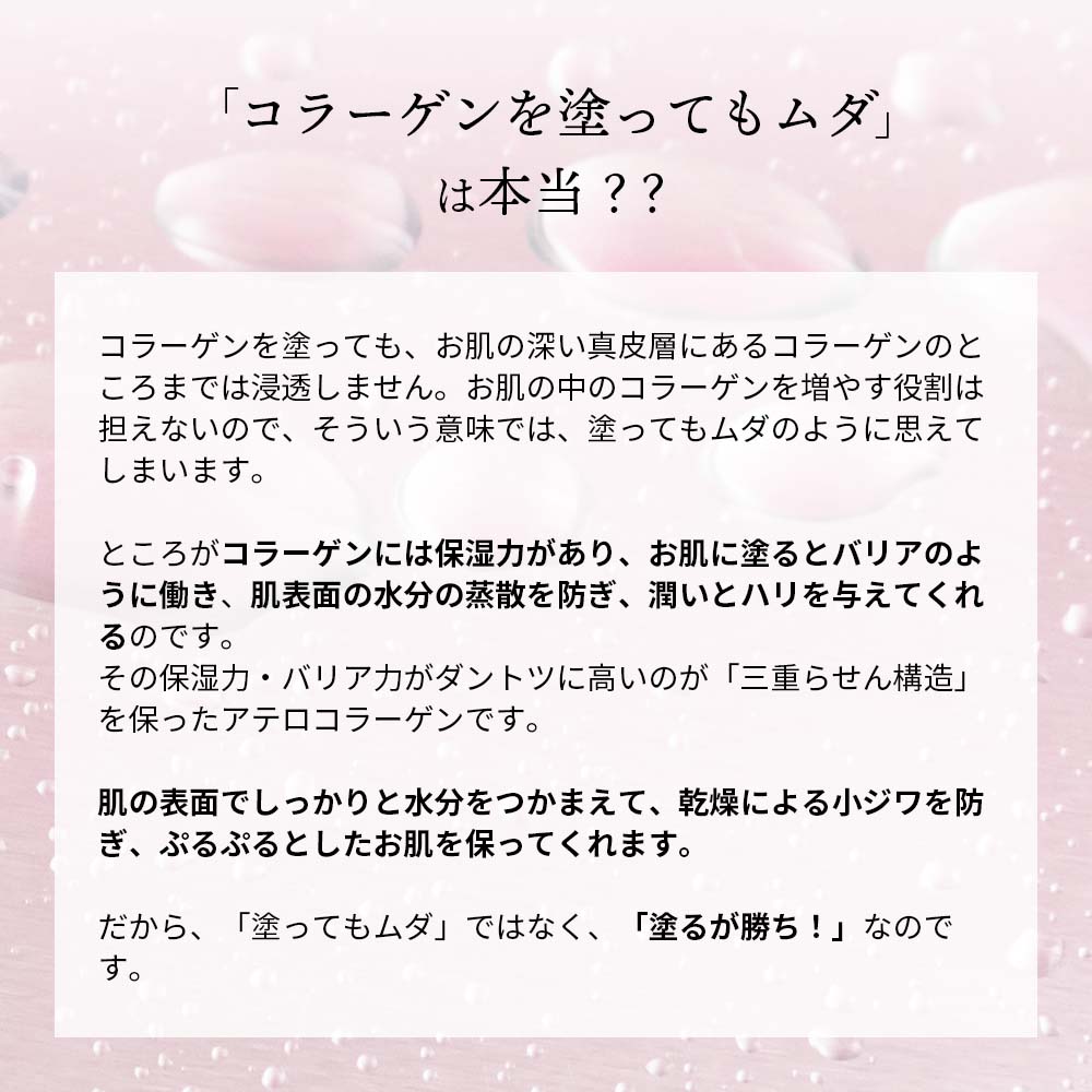 しっかりと水分をつかまえる「三重らせん構造」のアテロコラーゲンが、お肌をバリアし、水分の蒸散による乾燥を防いでくれます。
