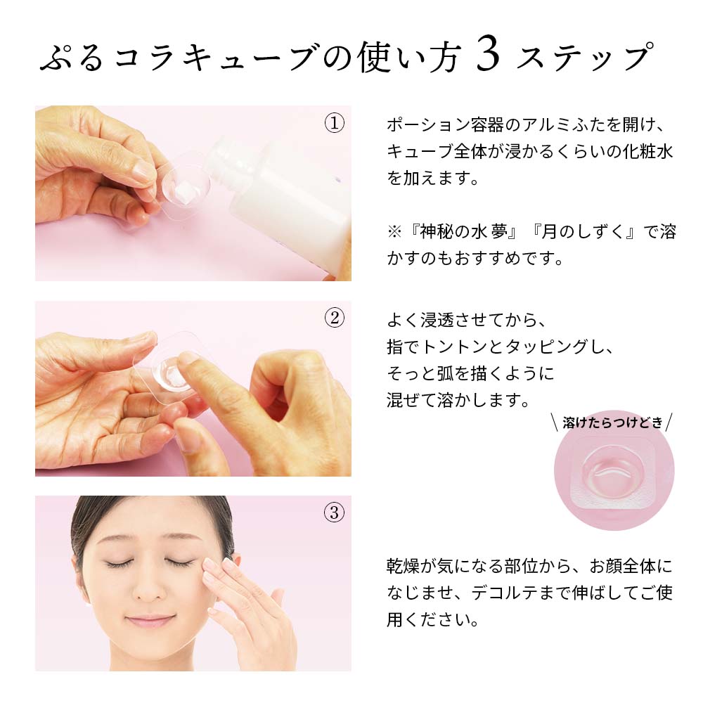 キューブ型の「ぷるコラキューブ」に、お手持ちの化粧水を混ぜるだけで、みるみるうちにとろ~り濃厚なコラーゲン美容液に変化します。