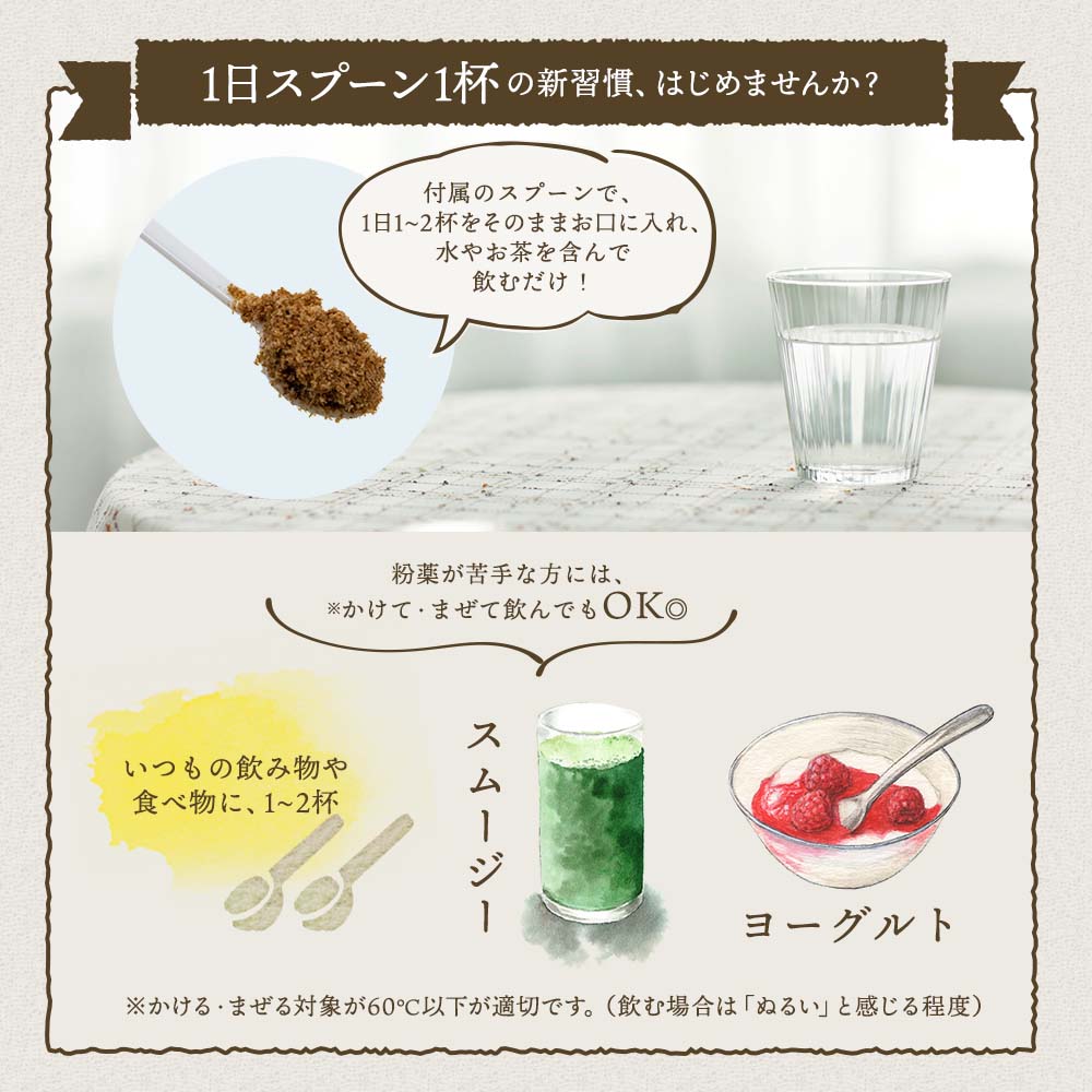 付属のスプーンで、1日1~2杯をそのままお口に入れ、水やお茶を含んで飲むだけ!