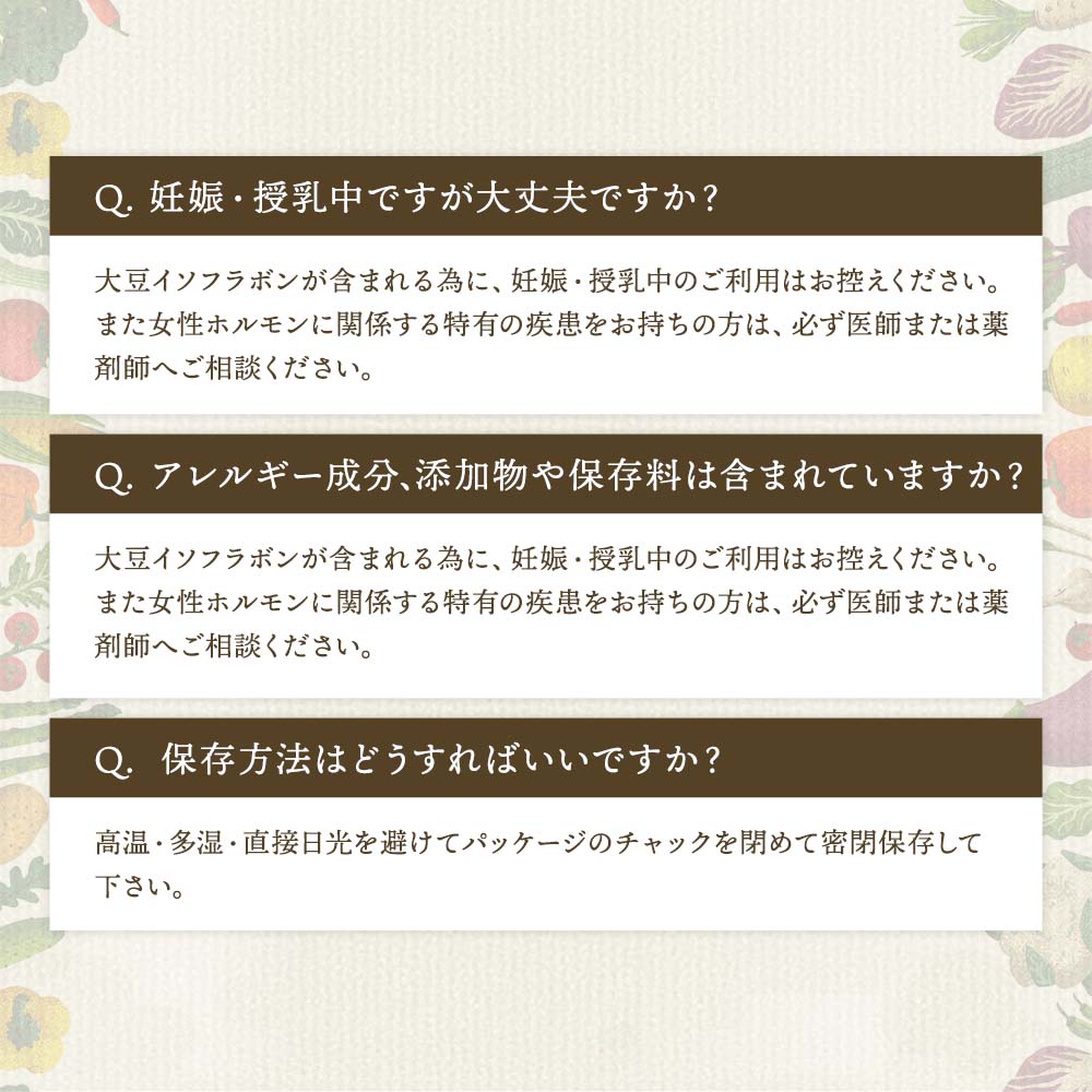 また、原料に大豆を使用していますので大豆アレルギーのある方はお飲みいただけません。 - Q. 妊娠・授乳中ですが大丈夫ですか?