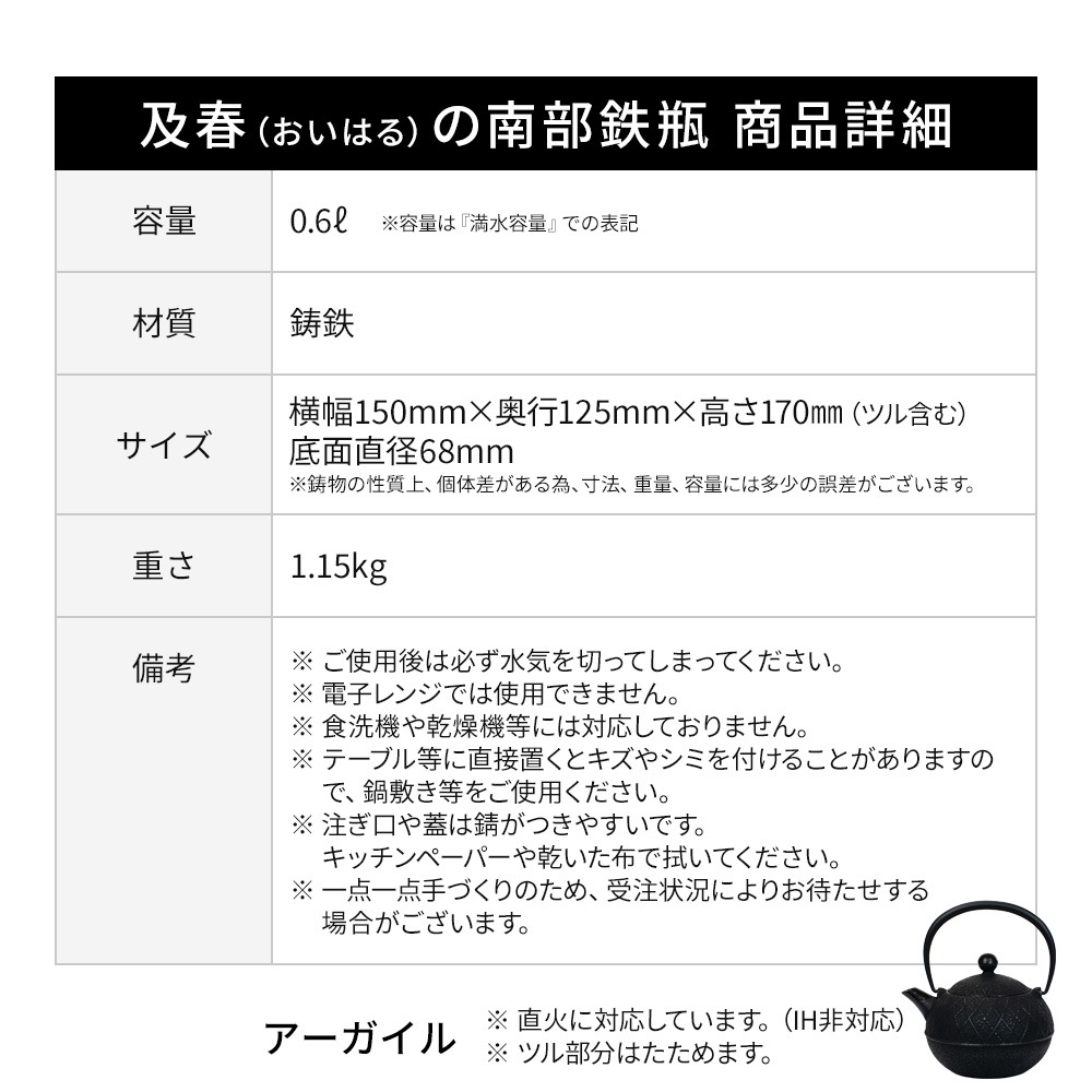 及春(おいはる)の南部鉄瓶アーガイル0.6リットル