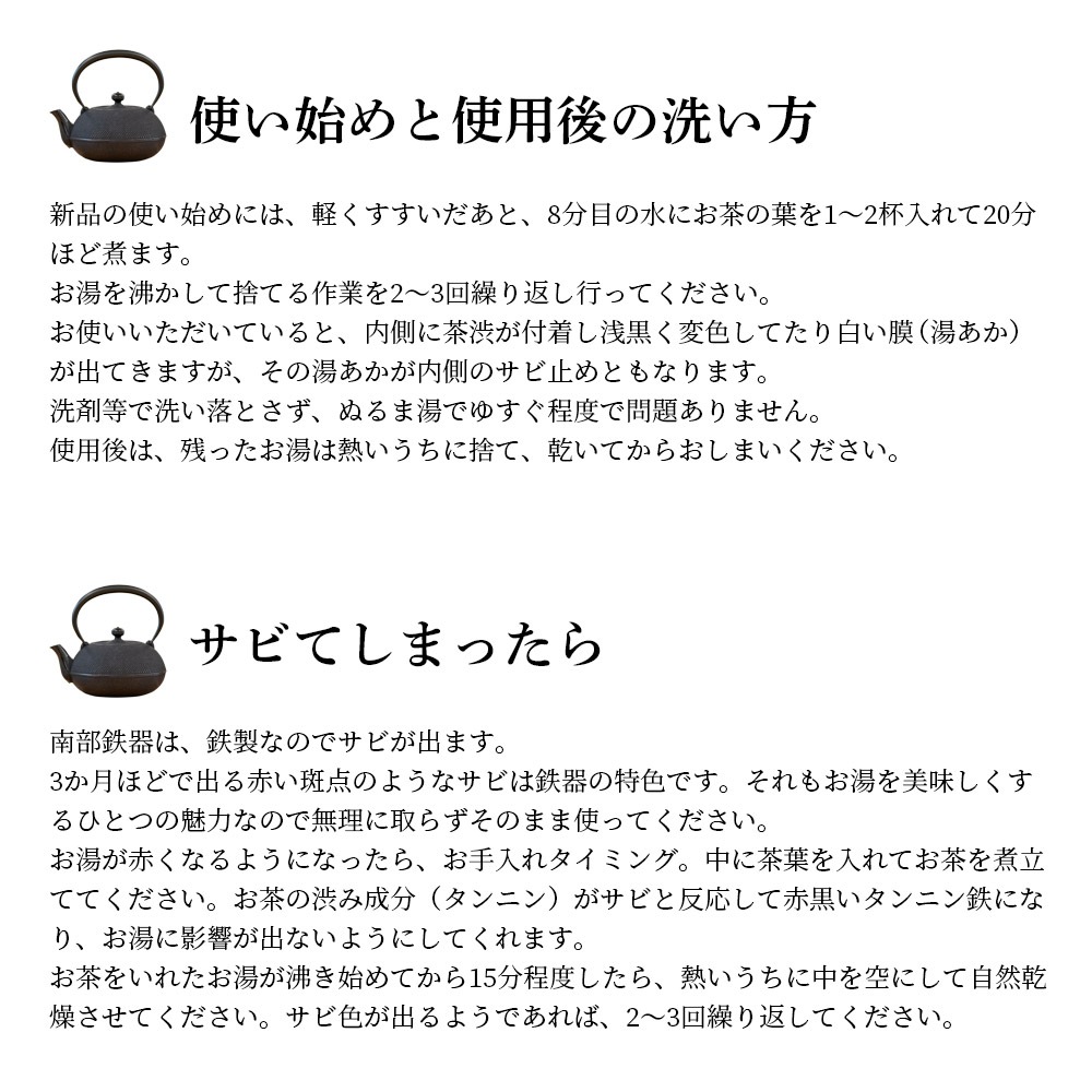 本来の製造方法に基づいた南部鉄瓶ならではの白湯のまろやかさ、そしてエイジングをお楽しみください。