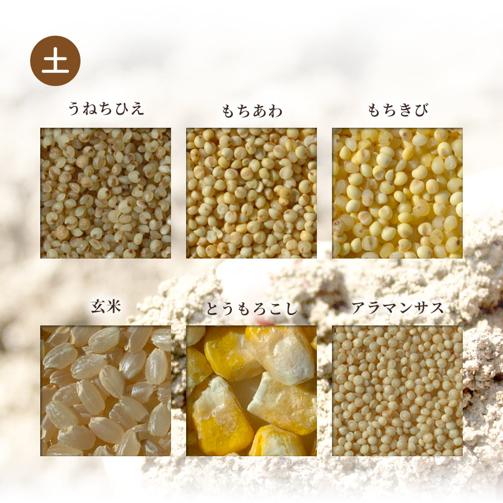 - 【土】うるちひえ、もちあわ、もちきび、玄米、とうもろこし、アラマンサス
