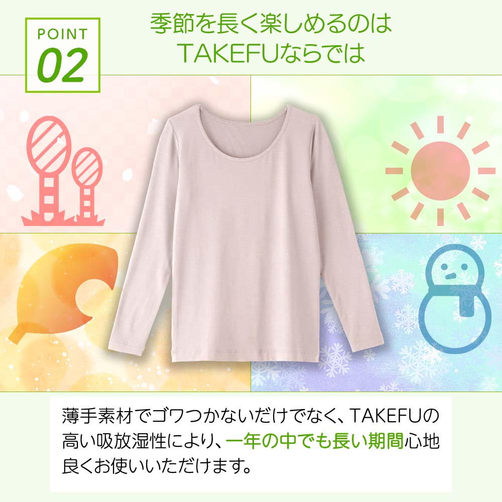 薄手素材でゴワつかないだけでなく、TAKEFUの高い吸放湿性により、一年の中でも長い期間心地良くお使いいただけます。