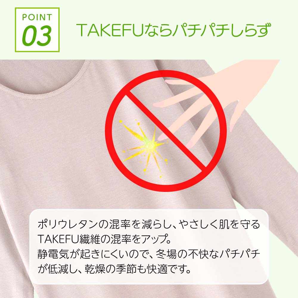 ポリウレタンの混率を減らし、やさしく肌を守るTAKEFU繊維の混率をアップ。