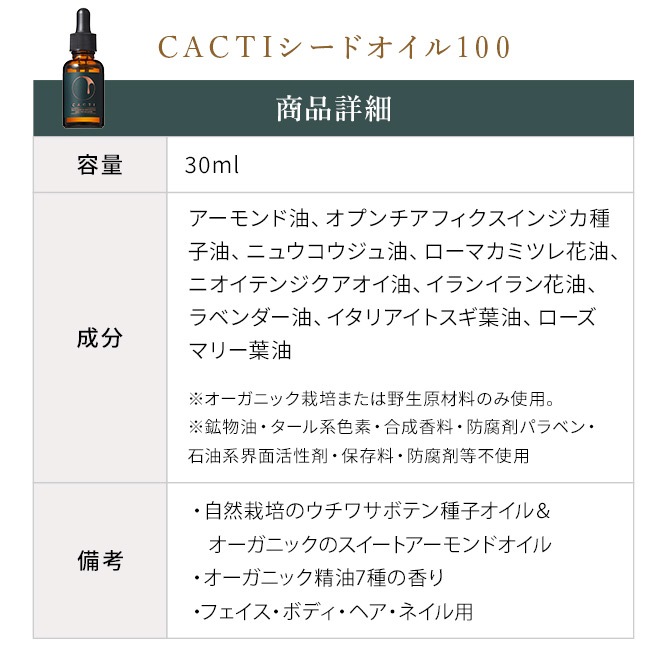 CACTIシードオイル100は、水を一切使わず、合成原料や人工的な香料などを使用せず、植物からの原料だけ。(不使用成分:鉱物油、タール系色素、合成香料、防腐剤パラペン、石油系界面活性剤)