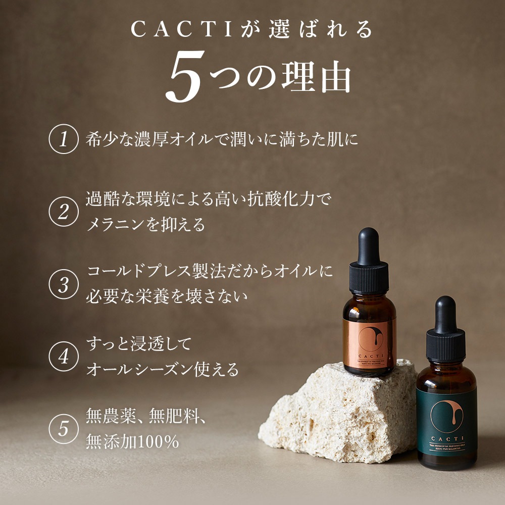 CACTIは、世界中から選びぬいた希少な「南アフリカ産ウチワサボテン種子オイル」を使用した浸透力抜群の美容オイルです。