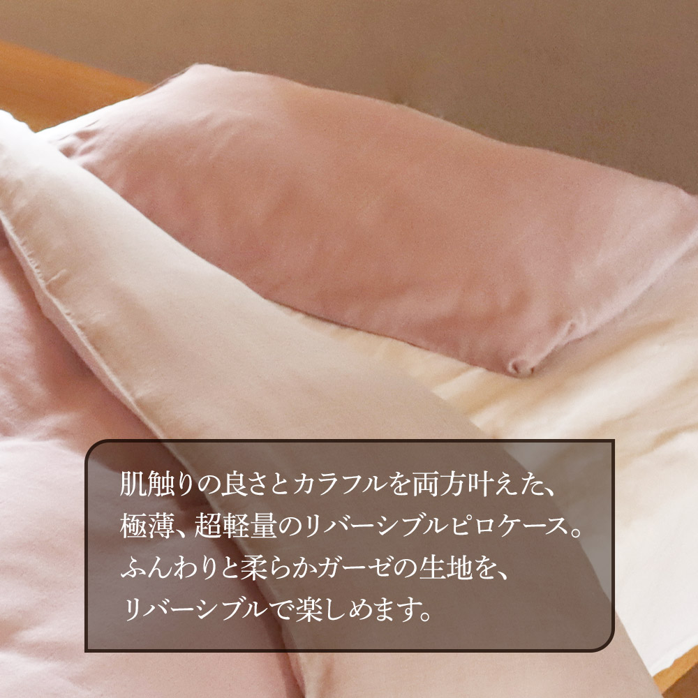 ふんわり柔らかな肌触り抜群のガーゼ生地でピローケースをつくりました。 インテリアを邪魔しない優しい色遣いです。羽毛掛布団カバーと同素材、お揃いでどうぞ。