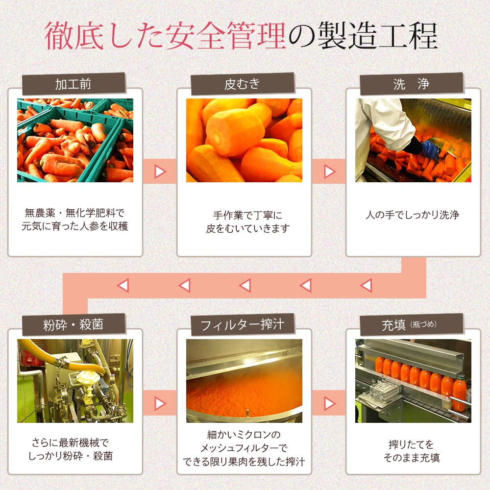 徹底した安全管理、作り手の温かな眼差しの下、にんじんジュースが製造されています。