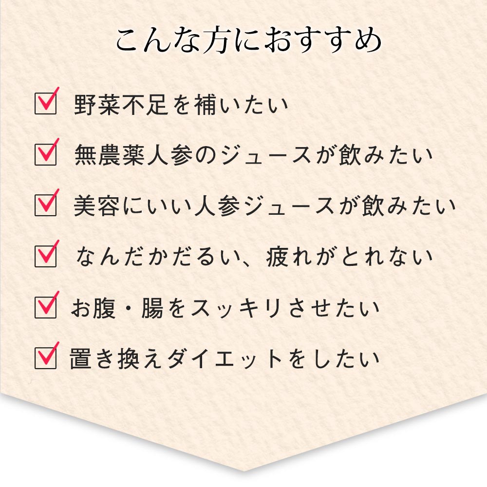 人参×りんごの黄金比率6:4でブレンド、国産レモンと梅エキスで味と品質を整えました。ゴクゴク飲めるフルーティーな美味しさだから、飽きずに毎日続けられます。