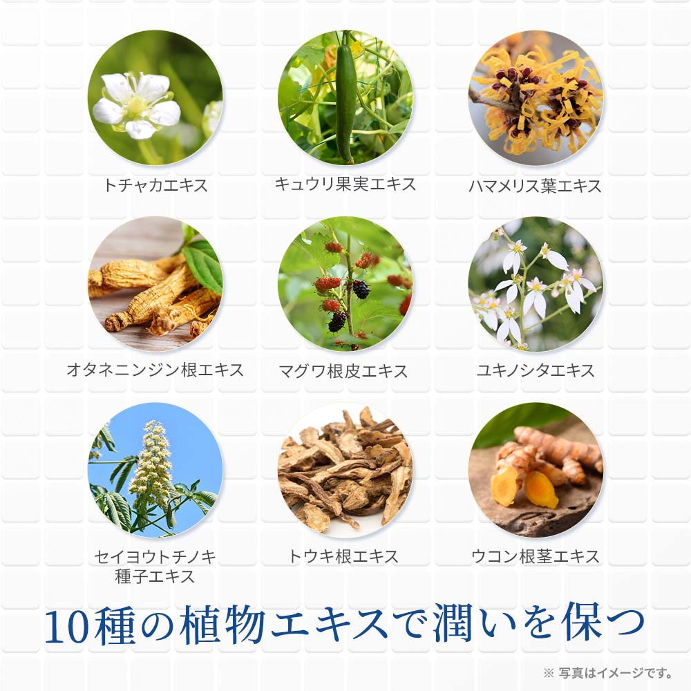 - トチャカエキス、褐藻エキス、ナットウガム、ヒアルロン酸Na、加水分解ヒアルロン酸、サッカロミセス溶解質エキス、ローヤルゼリーエキス、アラントイン、アルギニン、乳酸Na、乳酸、キュウリ果実エキス、ハマメリス葉エキス、オタネニンジン根エキス、マグワ根皮エキスなど