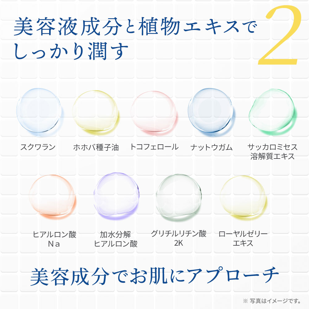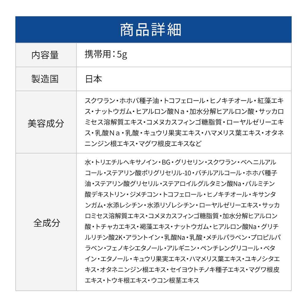 スクワラン・ホホバ種子油・トコフェロール・ヒノキチオール・紅藻エキス・ナットウガム・ヒアルロン酸Na・加水分解ヒアルロン酸・サッカロミセス溶解質エキス・コメヌカスフィンゴ糖脂質・ローヤルゼリーエキス・グリチルリチン酸2K・アラントイン・乳酸Na・乳酸・キュウリ果実エキス・ハマメリス葉エキス・オタネニンジン根エキス・マグワ根皮エキスなど