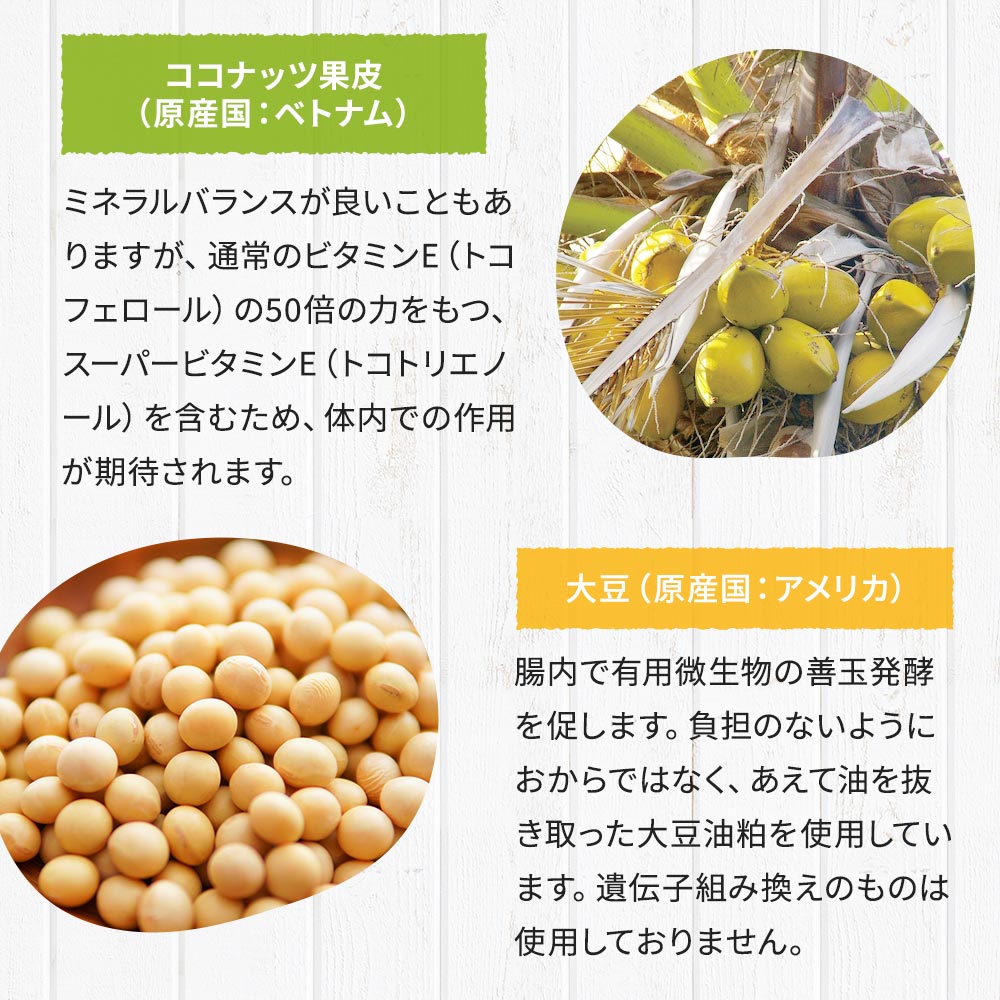 腸内で有用微生物の善玉発酵を促します。負担のないようにおからではなく、あえて油を抜き取った大豆油粕を使用しています。遺伝子組み換えのものは使用しておりません。 -