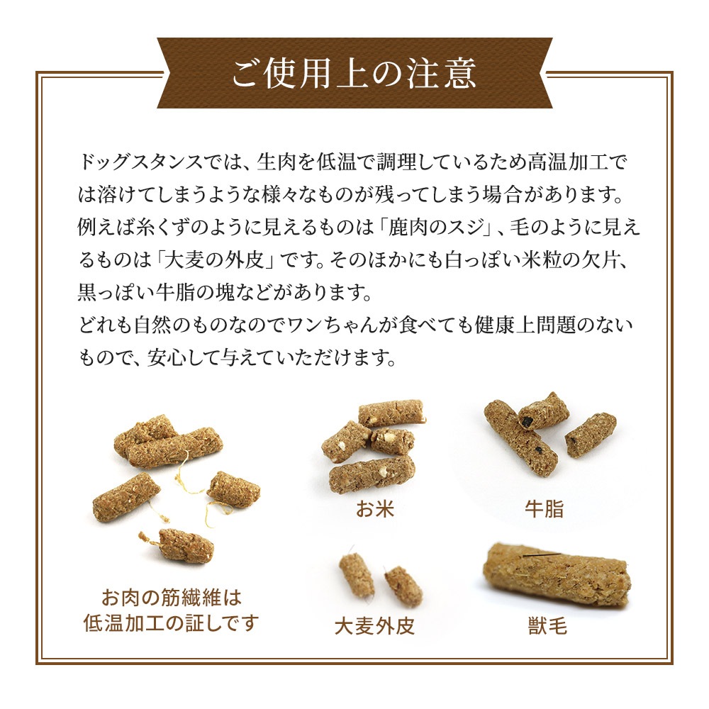 ドッグスタンスでは、生肉を低温で調理しているため高温加工では溶けてしまうような様々なものが残ってしまう場合があります。 例えば糸くずのように見えるものは「鹿肉のスジ」、毛のように見えるものは「大麦の外皮」です。そのほかにも白っぽい米粒の欠片、黒っぽい牛脂の塊などがあります。 どれも自然のものなのでワンちゃんが食べても健康上問題のないもので、安心して与えていただけます。