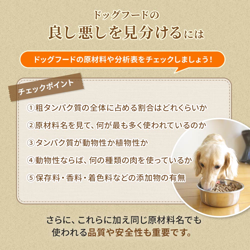 - ドッグスタンスのフードは、ワンちゃんにとって不必要なもの(着色料、保存料、香料や形をよくするための添加物)は使用しておりません。そのため、原材料や季節により、フードの色、形、匂いに多少の違いが生じる場合がございます。
