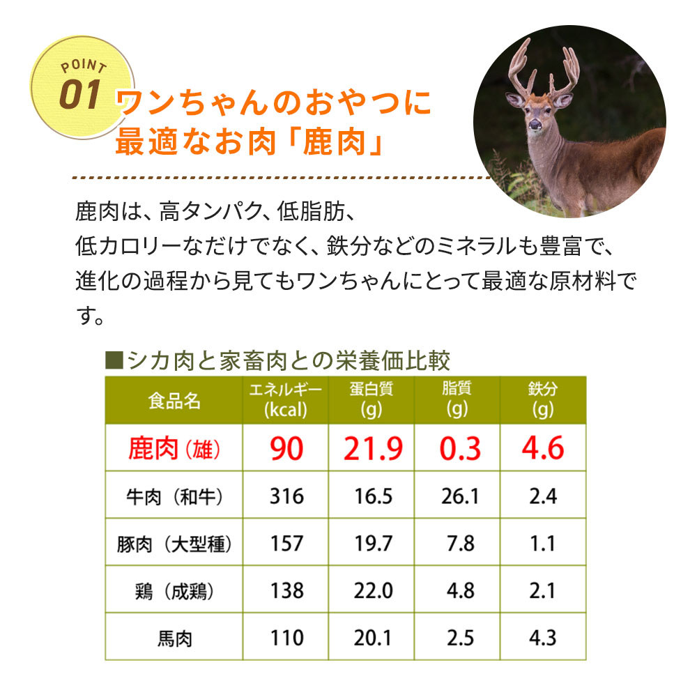 犬の祖先にとって、鹿肉は最大の栄養源。現代のワンちゃんにとっても、高タンパク・低脂質でローカロリー、鉄分などのミネラルも豊富。ワンちゃんの元気をサポートする栄養素がいっぱいに詰まっています。