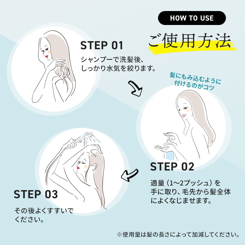 ![[使用方法]シャンプーで洗髪後、しっかり水気を絞ります。適量(1~2プッシュ)を手に取り、毛先から髪全体によくなじませます。その後よくすすいでください。](https://image.ima-coco.jp/item/TS031/14.jpg)