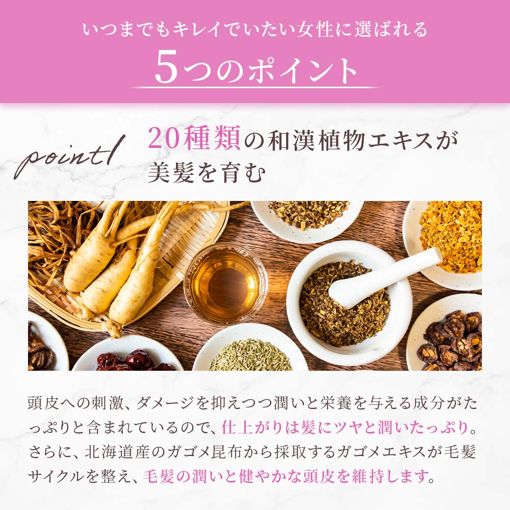 - Point120種類の和漢植物エキスが美髪を育む