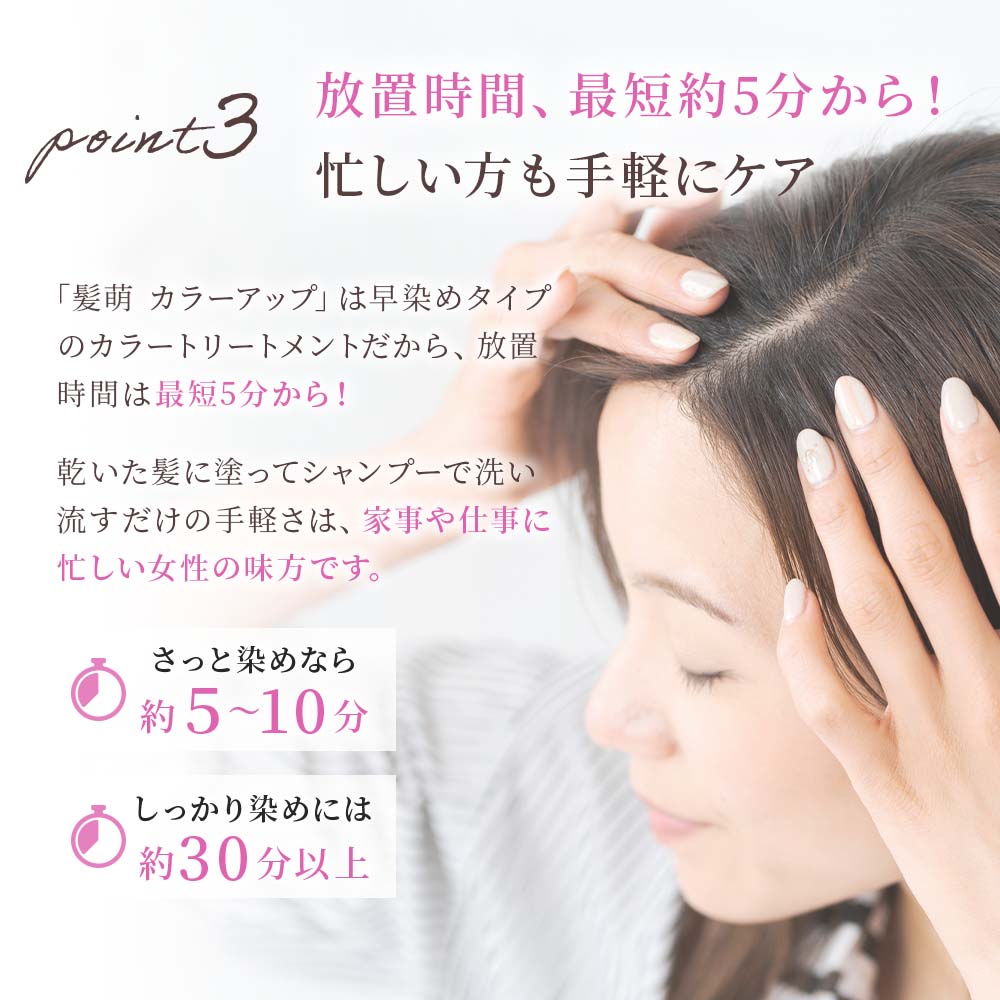 「髪萌 カラーアップ」は早染めタイプのカラートリートメントだから、放置時間は最短5分から!