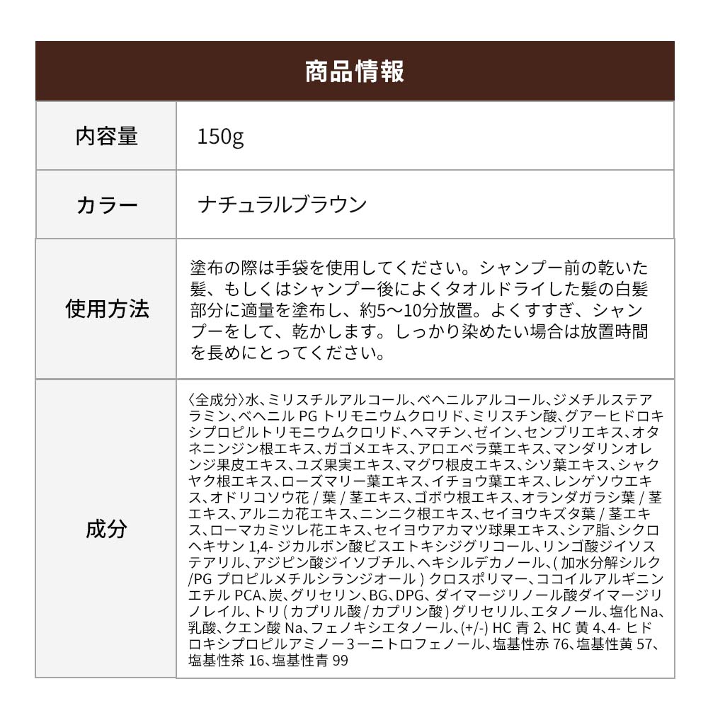 - 〈全成分〉水、ミリスチルアルコール、ベヘニルアルコール、ジメチルステアラミン、ベヘニルPGトリモニウムクロリド、ミリスチン酸、グアーヒドロキシプロピルトリモニウムクロリド、ヘマチン、ゼイン、センブリエキス、オタネニンジン根エキス、ガゴメエキス、アロエベラ葉エキス、マンダリンオレンジ果皮エキス、ユズ果実エキス、マグワ根皮エキス、シソ葉エキス、シャクヤク根エキス、ローズマリー葉エキス、イチョウ葉エキス、レンゲソウエキス、オドリコソウ花/葉/茎エキス、ゴボウ根エキス、オランダガラシ葉/茎エキス、アルニカ花エキス、ニンニク根エキス、セイヨウキズタ葉/茎エキス、ローマカミツレ花エキス、セイヨウアカマツ球果エキス、シア脂、シクロヘキサン 1,4-ジカルボン酸ビスエトキシジグリコール、リンゴ酸ジイソステアリル、アジピン酸ジイソブチル、ヘキシルデカノール、(加水分解シルク/PGプロピルメチルシランジオール)クロスポリマー、ココイルアルギニンエチルPCA、炭、グリセリン、BG、DPG、 ダイマージリノール酸ダイマージリノレイル、トリ(カプリル酸/カプリン酸)グリセリル、エタノール、塩化Na、乳酸、クエン酸Na、フェノキシエタノール、(+/-) HC青2、HC黄4、4-ヒドロキシプロピルアミノー3ーニトロフェノール、塩基性赤76、塩基性黄 57、塩基性茶16、塩基性青99
