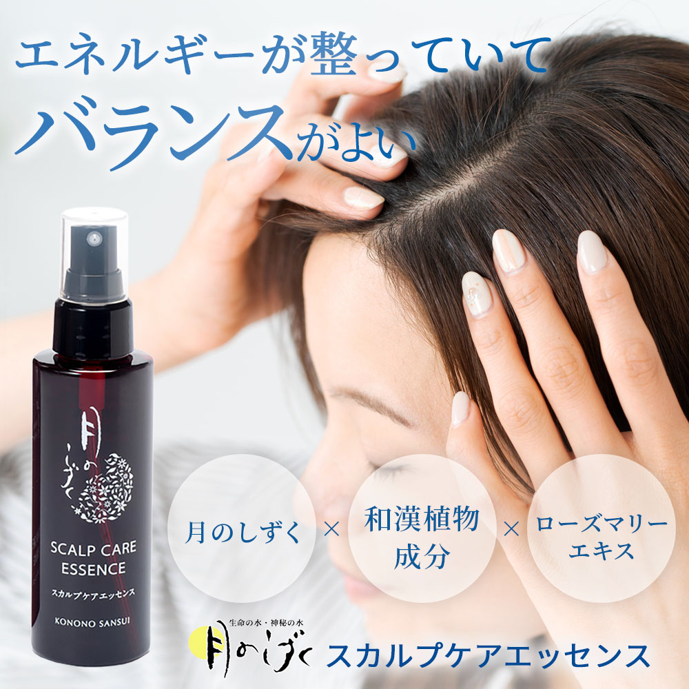 「金水」「銀水」「銅水」の3つのお水に毛髪や頭皮のための和漢植物成分、そしてローズマリーのエキスを加え、全成分のエネルギーが整っていてバランスがよい、月のしずく スカルプケアエッセンスがおすすめです。
