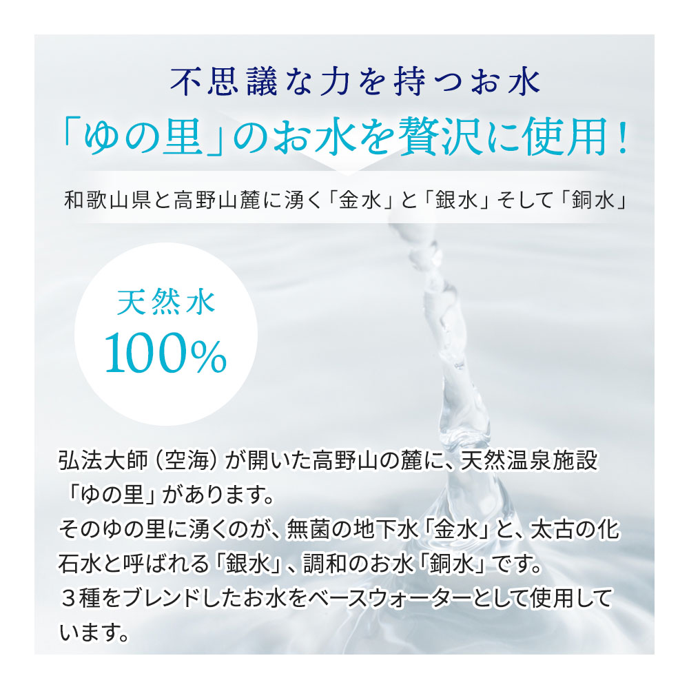 弘法大師(空海)が開いた高野山の麓に、天然温泉施設「ゆの里」があります。 そのゆの里に湧くのが、無菌の地下水「金水」と、太古の化石水と呼ばれる「銀水」、調和のお水「銅水」です。 3種をブレンドしたお水をベースウォーターとして使用しています。