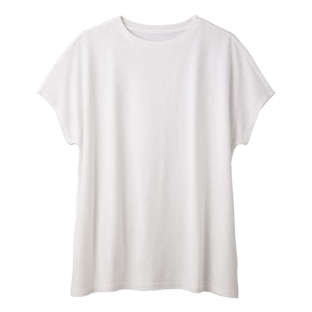 ほどよい開き具合の首元はシンプルなUネックで、TAKEFUの素材そのものを楽しめるシンプルなデザイン。暑い夏も肌にまとわりつかずに快適です。