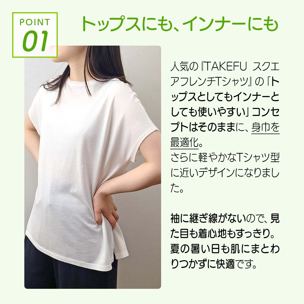 人気の「TAKEFU スクエアフレンチTシャツ」の「トップスとしてもインナーとしても使いやすい」コンセプトはそのままに、身巾を最適化。