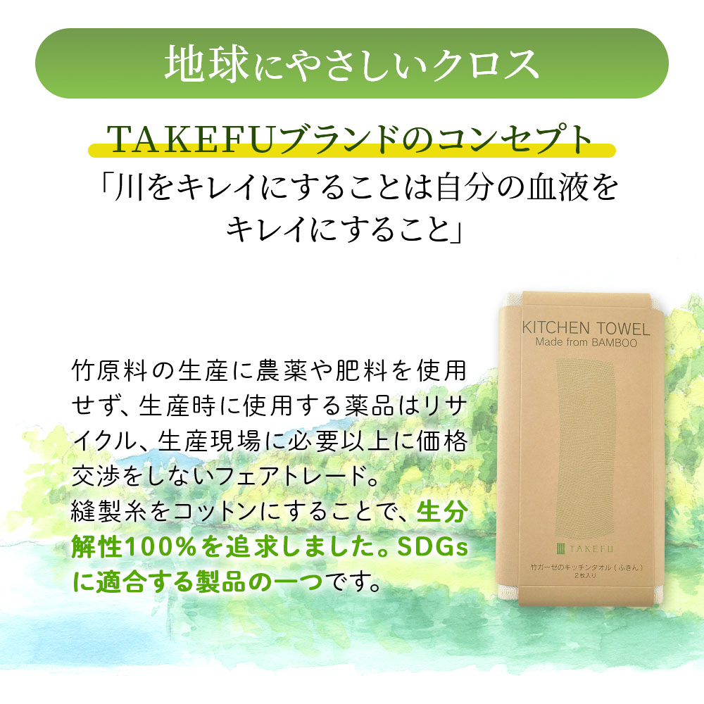 竹ガーゼのキッチンタオルはTAKEFU(竹繊維)100%。天然の抗菌・消臭性で、キッチンでのご使用も衛生的で安心です。