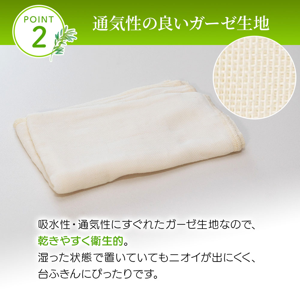 吸水性・通気性にすぐれたガーゼ生地なので、乾きやすく衛生的。湿った状態で置いていてもニオイが出にくく、台ふきんにぴったりです。