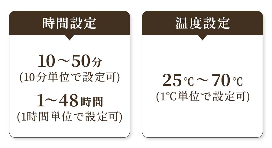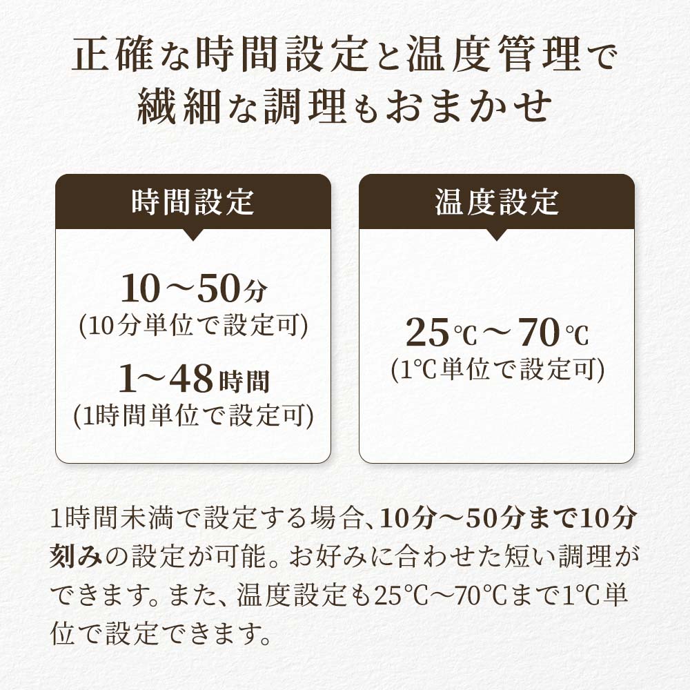 1時間未満で設定する場合、10分~50分まで10分刻みの設定が可能。お好みに合わせた短い調理ができます。また、温度設定も25℃~70℃まで1℃単 位で設定できます。