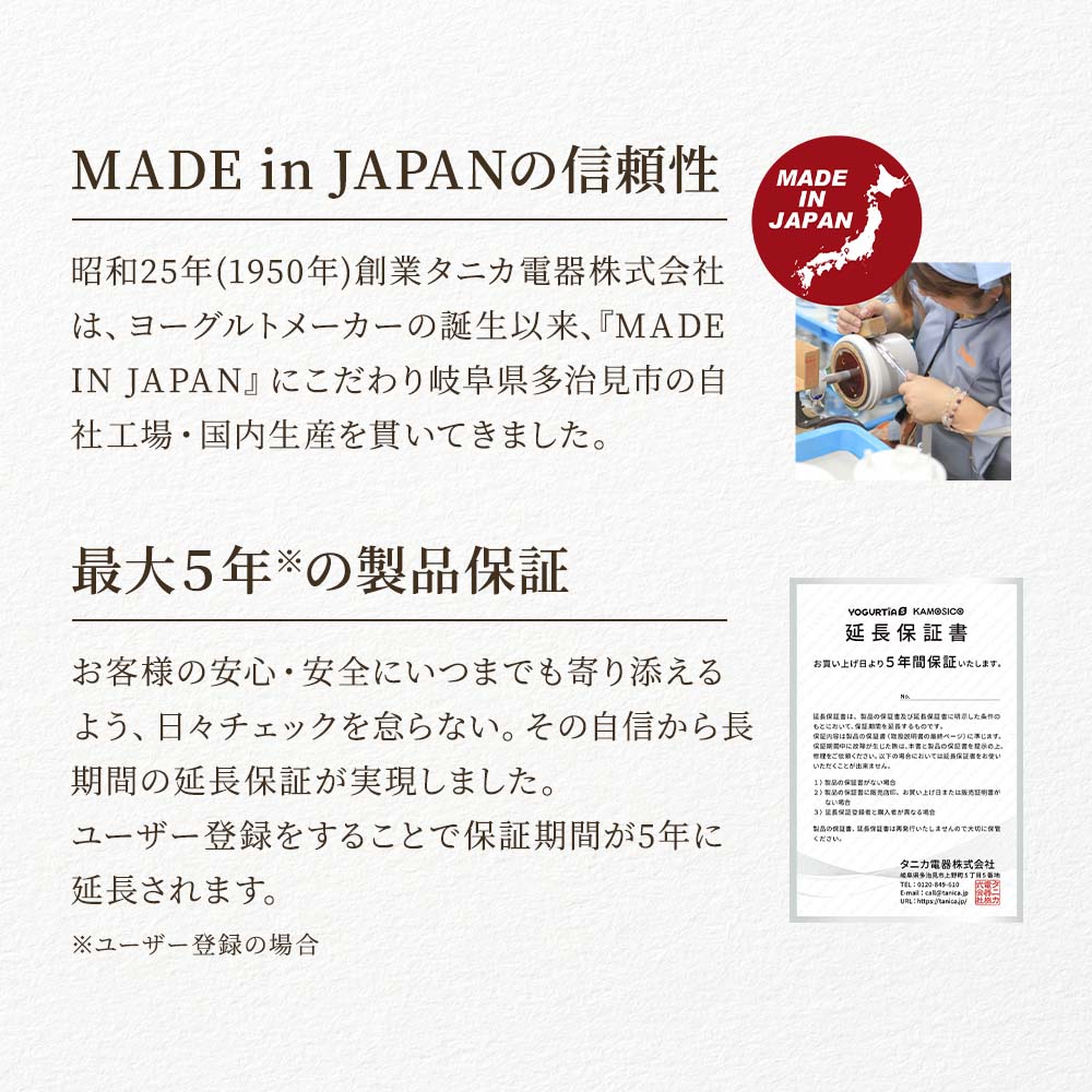 昭和25年(1950年)創業タニカ電器株式会社は、ヨーグルトメーカーの誕生以来、「MADE IN JAPAN」にこだわり岐阜県多治見市の自社工場・国内生産を貫いてきました。