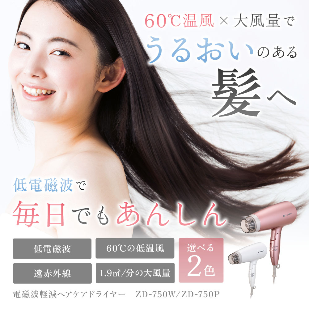 電磁波低減ヘアケアドライヤーなら、60℃温風、低電磁波だからやさしい