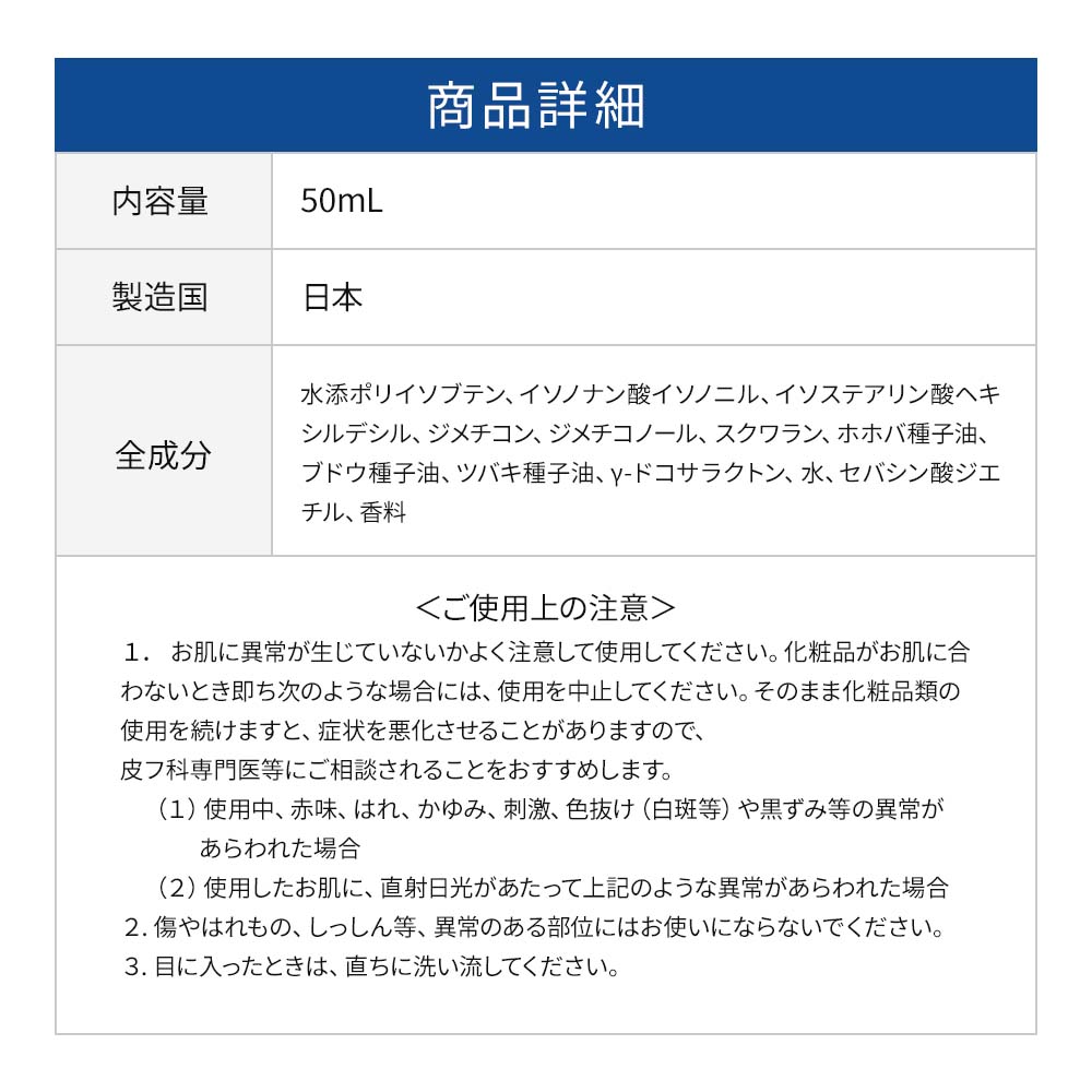 - 水添ポリイソブテン、イソノナン酸イソノニル、イソステアリン酸ヘキシルデシル、ジメチコン、ジメチコノール、スクワラン、ホホバ種子油、ブドウ種子油、ツバキ種子油、γ-ドコサラクトン、水、セバシン酸ジエチル、香料