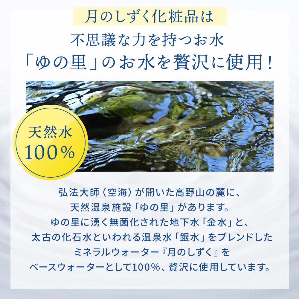 「ゆの里のお風呂に入ると癒やされる」「痛かったところが治る」など、お水の持つ不思議な力が口コミで評判となり、アトピーなど肌に悩みのある方や心身の癒しを求める方が、全国からゆの里を訪れます。湯治客の「自宅でもゆの里のお水を飲みたい」「ゆの里のお水にいつも触れていたい」というお声にこたえて生まれたのが、ゆの里「月のしずく」シリーズの商品です。