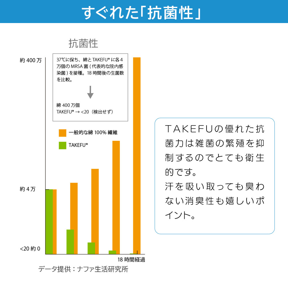 ※TAKEFU®は、竹原料100%で作られた再生セルロース繊維(レーヨン)で、(株)ナファ生活研究所が所有する登録商標です。レーヨンとは木や竹などの植物から作られる繊維で、石油を原料とする合成繊維とは異なります。
