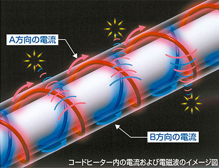 コードヒーターの中に電流の向きが異なる2本の熱線を交互に巻きつけることにより、電気が流れることで発生する電磁波(磁界)同士が打ち消し合い(相殺)、電磁波(磁界)の発生を抑えました。