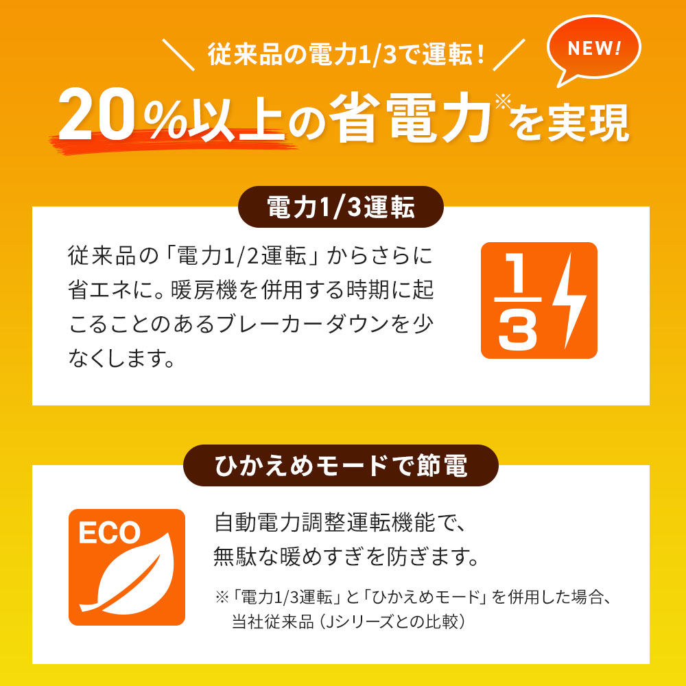 従来品の「電力1/2運転」からさらに省エネに。暖房機を併用する時期に起こることのあるブレーカーダウンを少なくします。