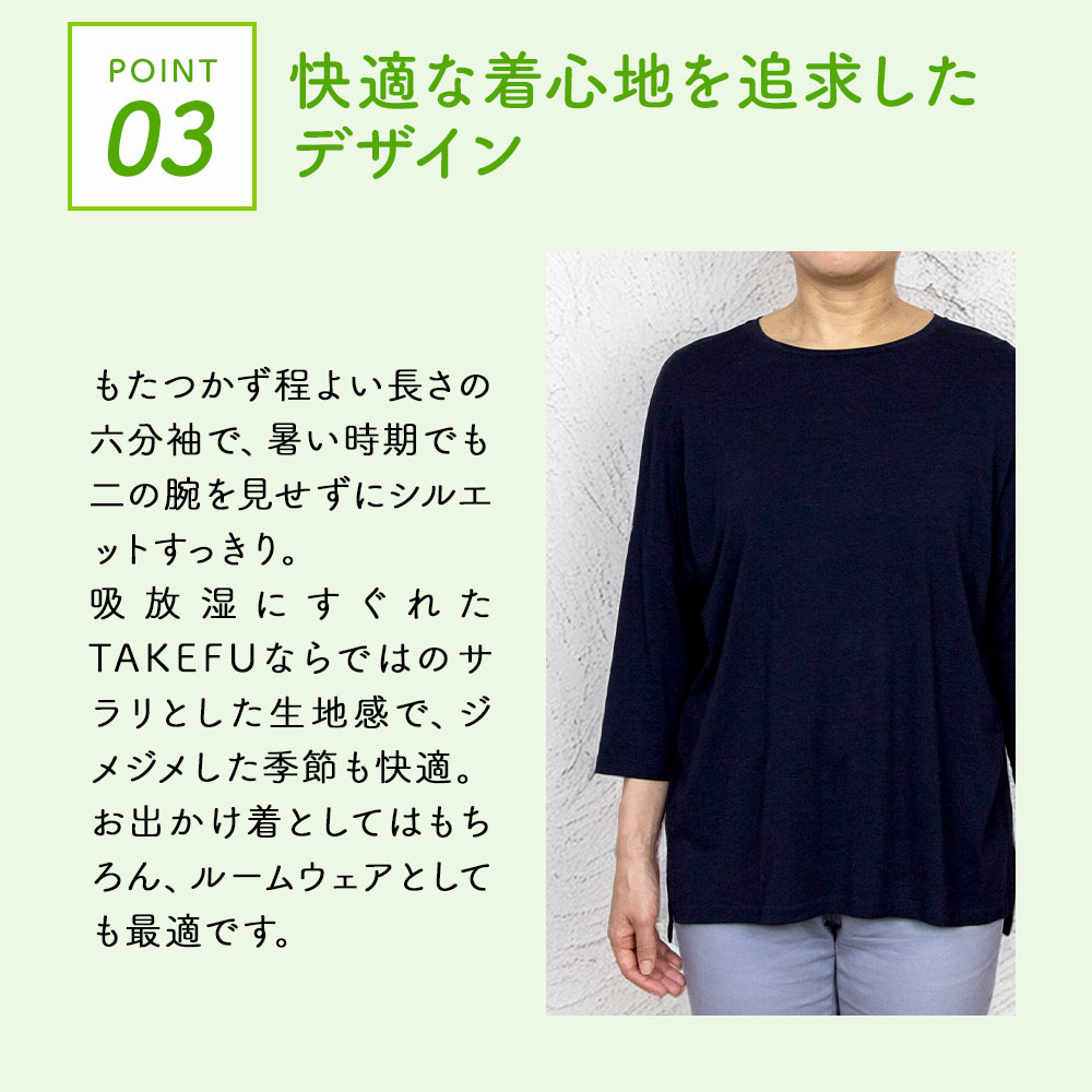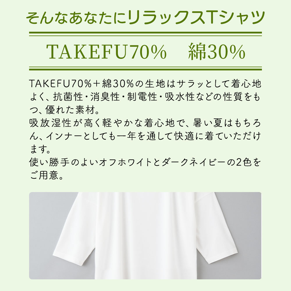 TAKEFU70%+綿30%の生地はサラッとして着心地よく、抗菌性・消臭性・制電性・吸水性などの性質をもつ、優れた素材。